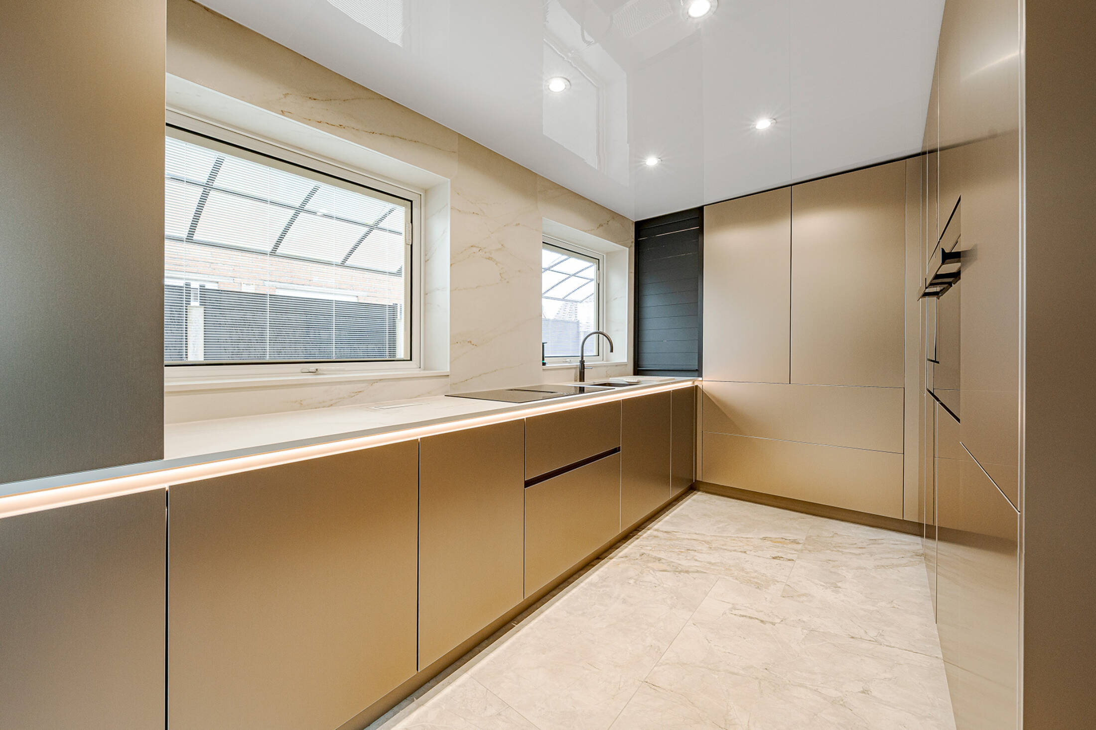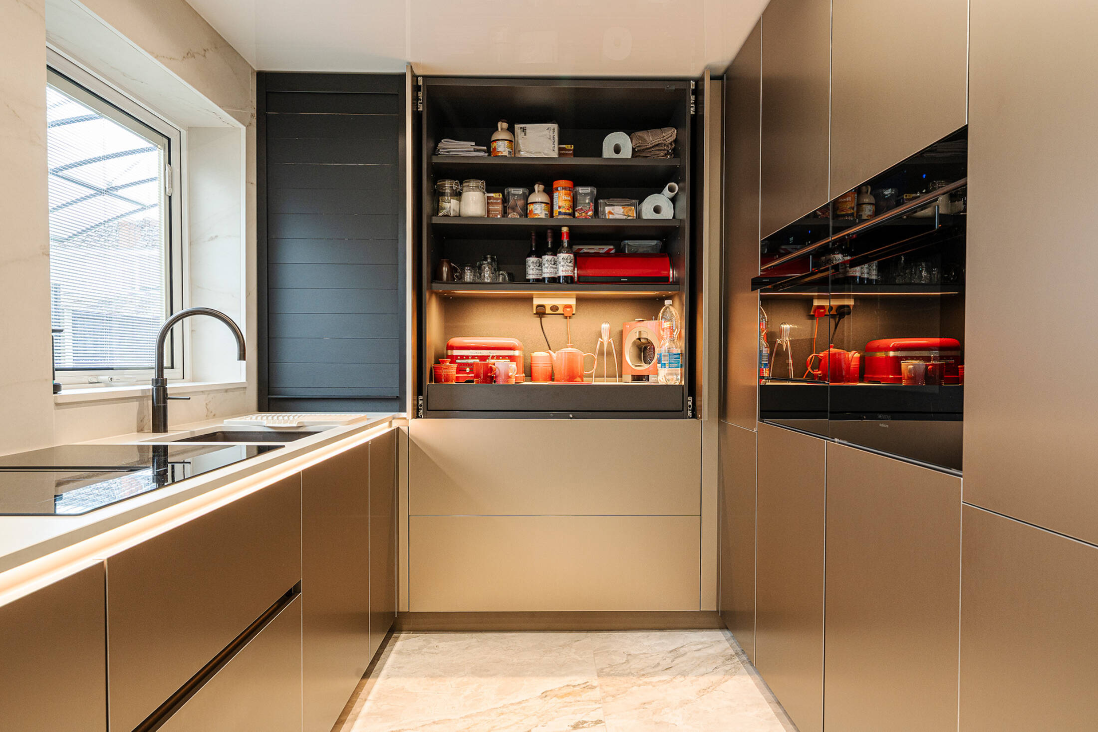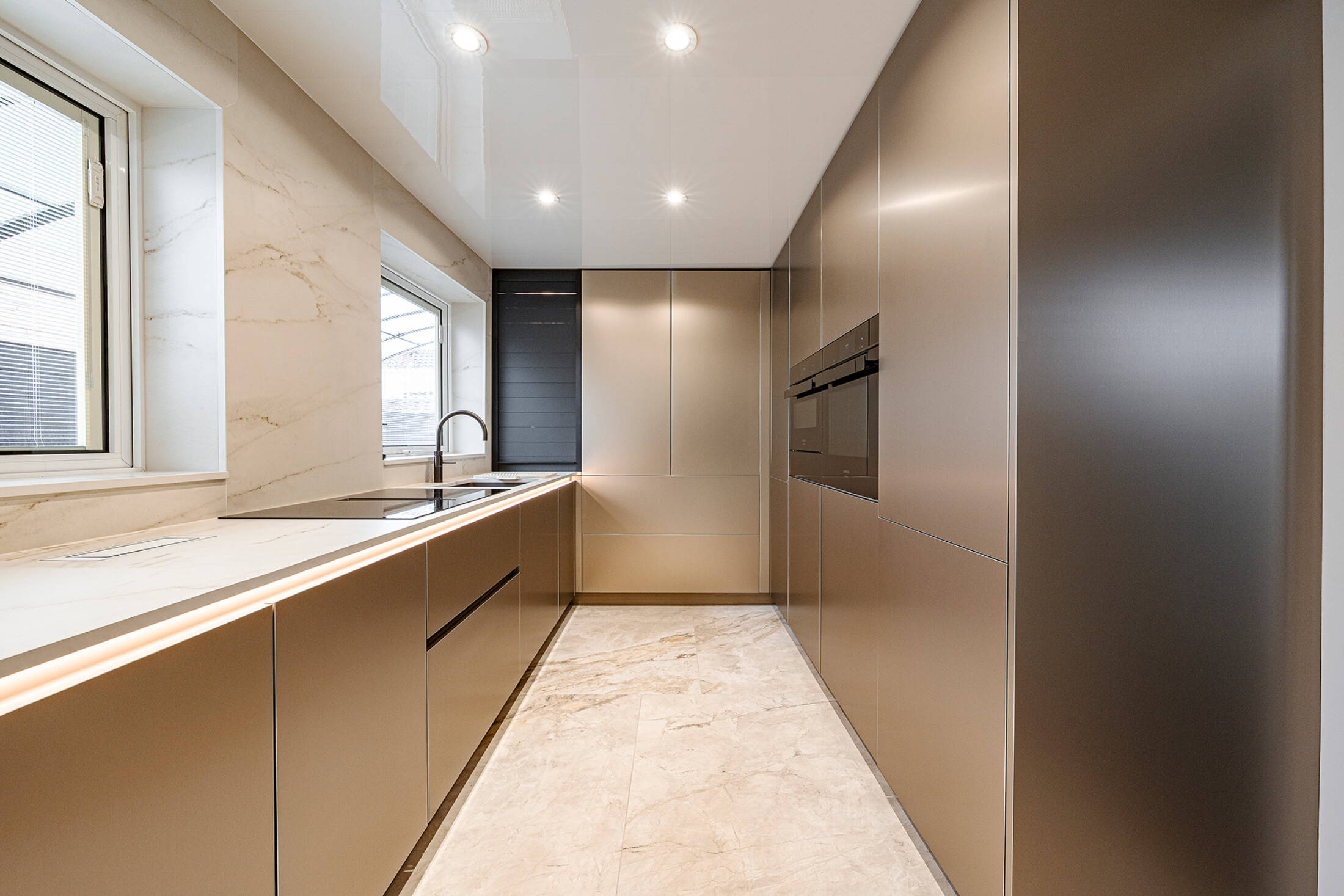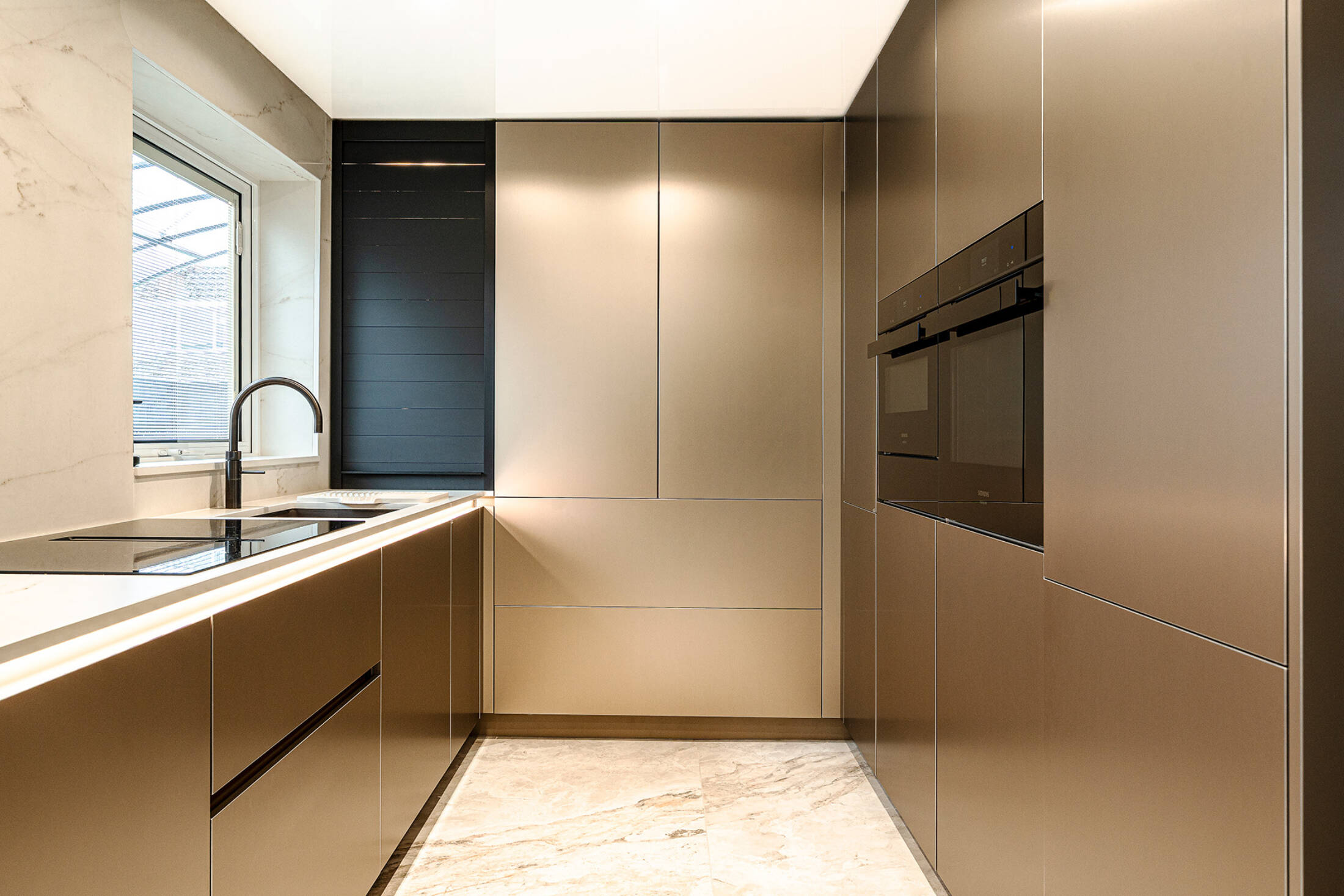 Features Aluro - Oxide Bronze doors and DEKTON worktops .