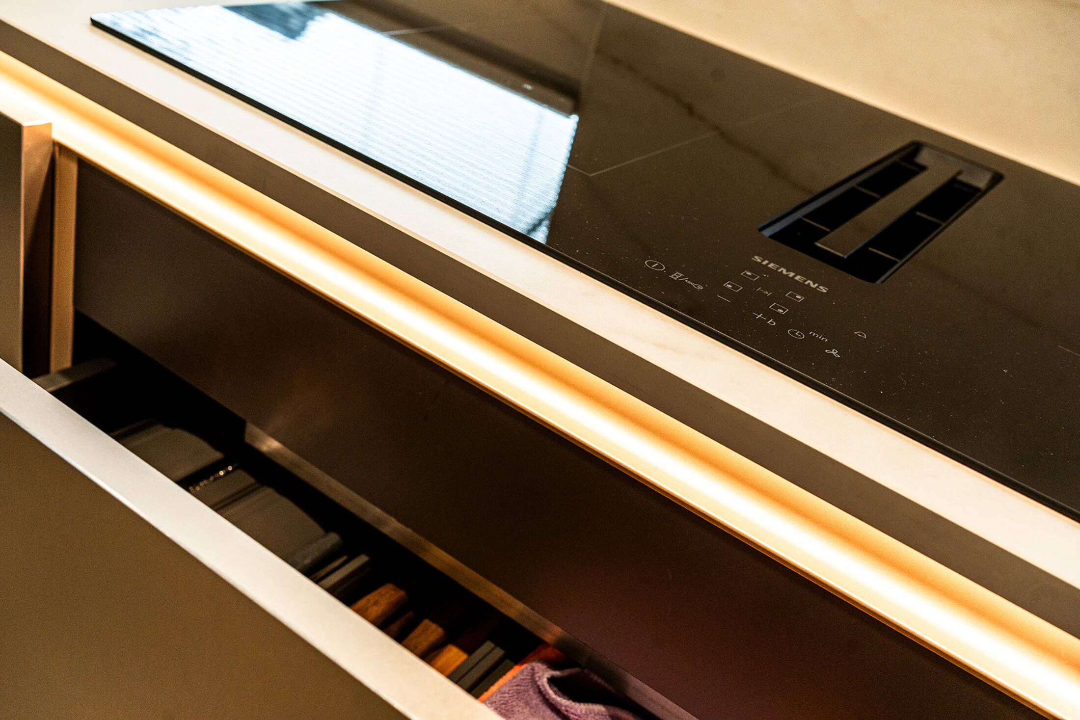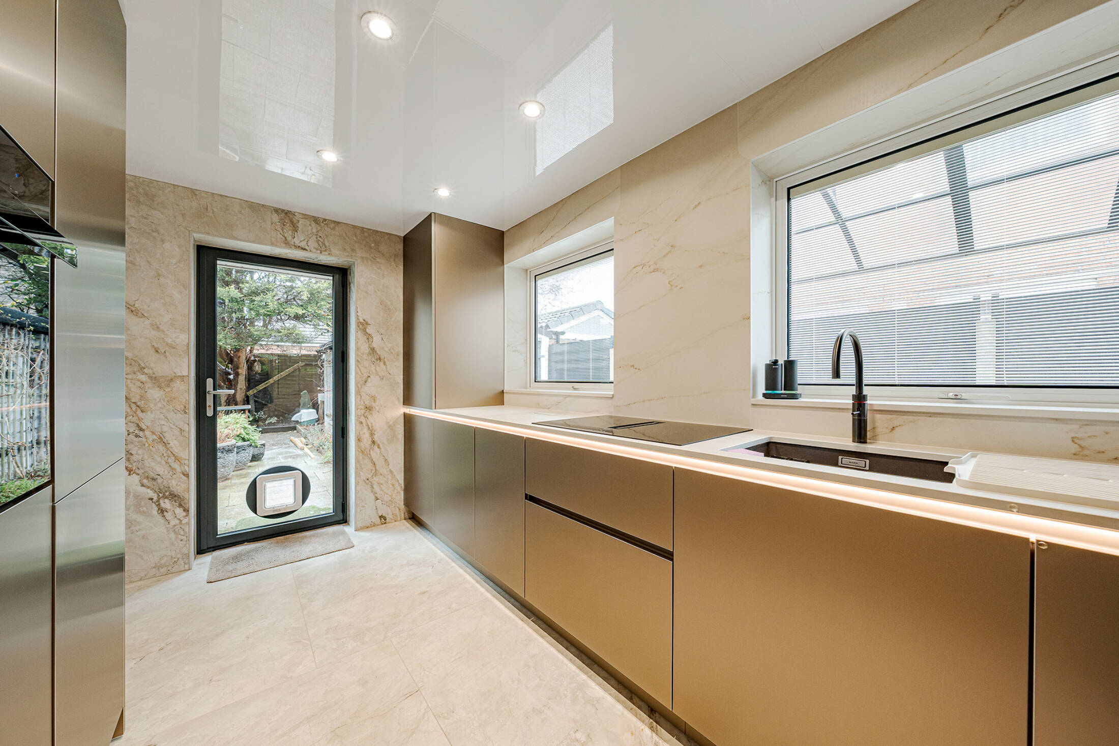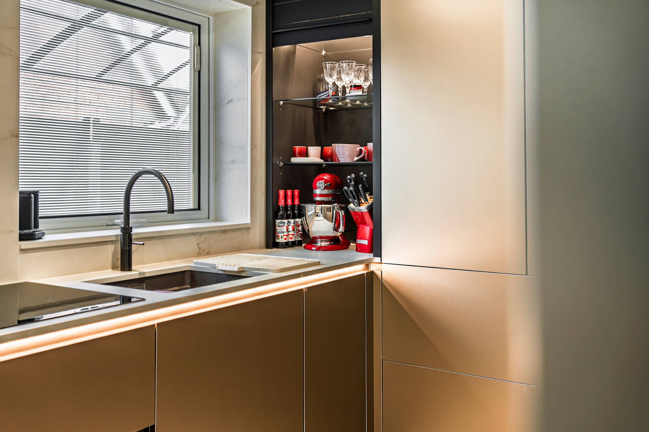 Features Aluro - Oxide Bronze doors and DEKTON worktops .